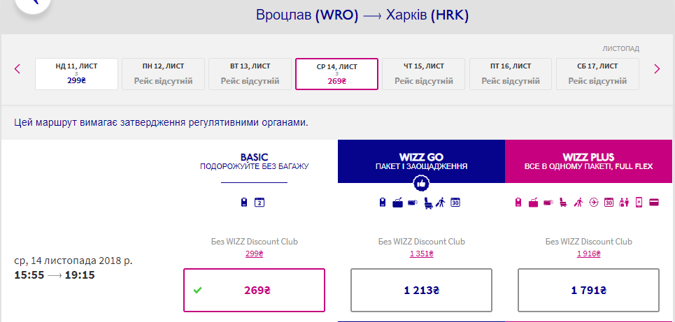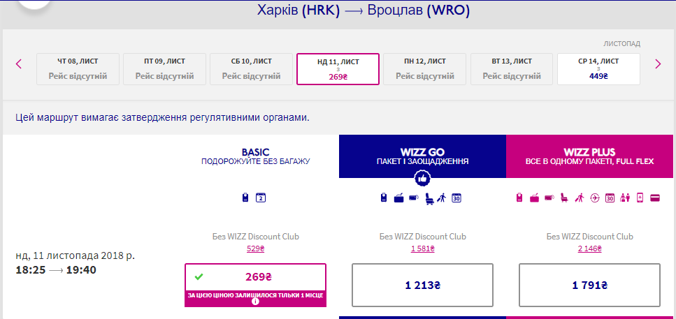 Харків – Вроцлав, 11-14 листопада – 16 євро чи 30 євро для інших пасажирів. У два боки