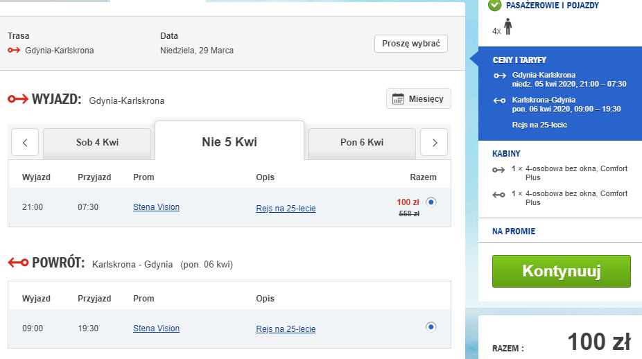 Відправлення з Карлскруна 6 квітня о 09:00, прибуття в Гдиню о 19:30.