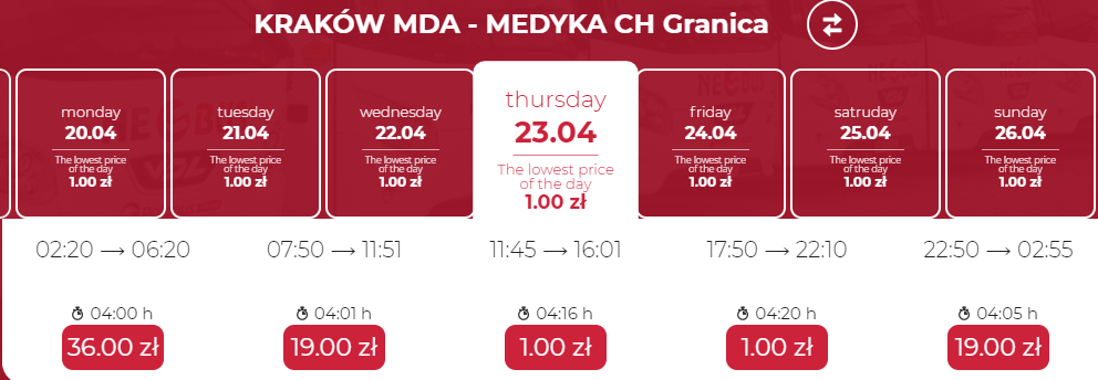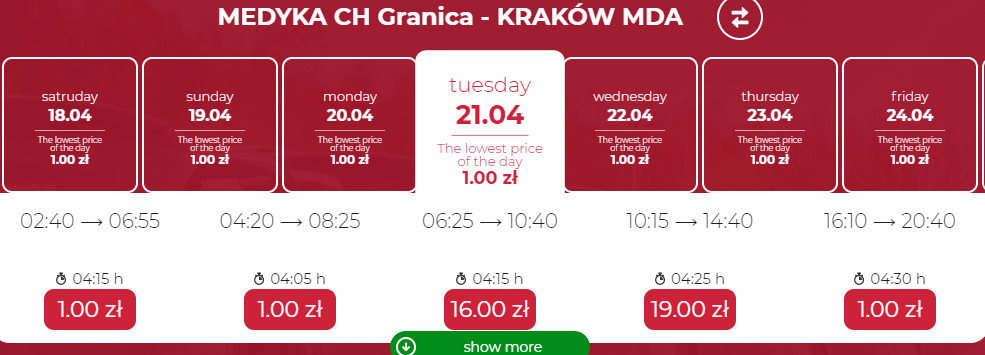 Акційні квитки можна придбати на маршрути з міст біля українсько-польського кордону: Медика, Перемишля та Ярослава до Кракова (в.т.ч. аеропорт), Варшави (в.т.ч. аеропорт Шопена), Катовіце, Вроцлава, Лодзь, Жешува.