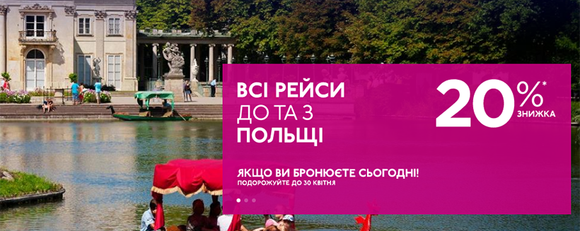 Авіакомпанія Wizz Air проводить акцію та пропонує перельоти в/з Польщі зі знижкою 20%. Забронювати квитки можна лише сьогодні, 20 березня. Подорож плануємо до 30 квітня.