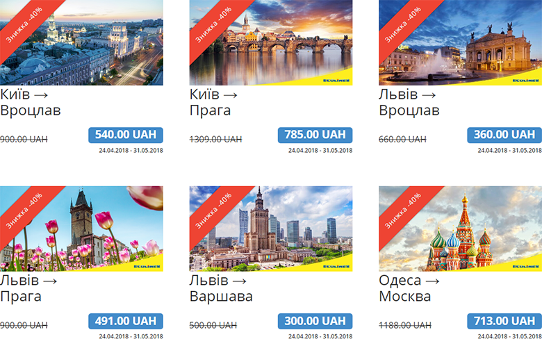 Компанія надає знижку 40% тим, хто придбає квитки з 24 квітня 2018 р. по 31 травня 2018 р. і запланує подорож в період з 04 червня 2018 р. по 27 червня 2018 р.
