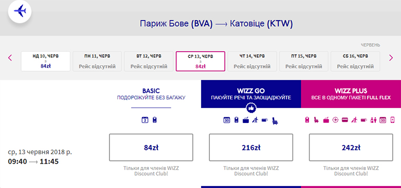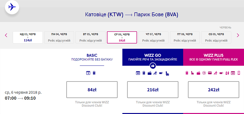 В качестве примера предлагаем перелет Катовице – Париж. Рейс вылетает 6 июня, возвращается 13 июня 2018 г. Стоимость – €43 в обе стороны.