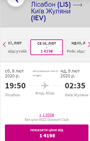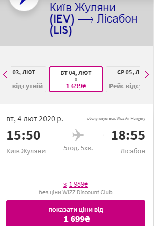 Авіакомпанія Wizz Air пропонує знижені ціни на прямі рейси з Києва у Лісабон. Забронювати квитки можна на сайті авіакомпанії або на Skyscanner.