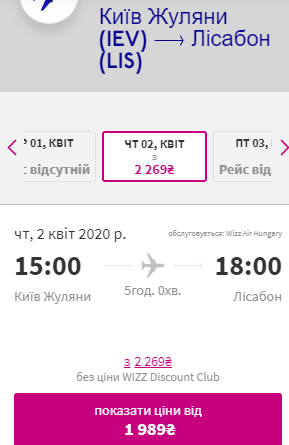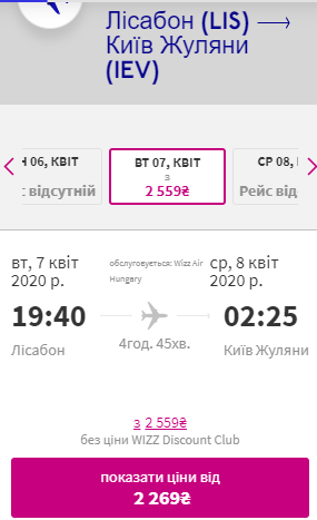 Авіакомпанія Wizz Air пропонує знижені ціни на прямі рейси з Києва у Лісабон у квітні. Забронювати квитки можна на сайті авіакомпанії або на Skyscanner.