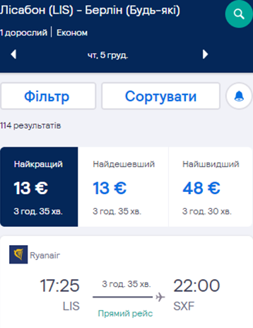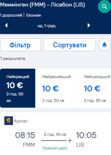 Летимо з Києва в Лісабон через Меммінген та назад – через Берлін. Дати подорожі – 30 листопада – 6 грудня. Вартість квитків у два боки – €58 для учасників wizz-клубу та €68 для всіх інших.