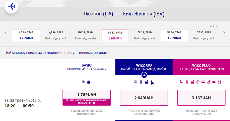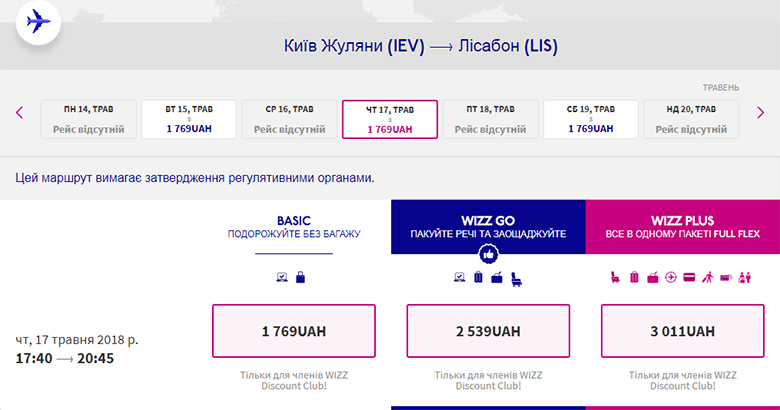 На данный момент на рейсы Киев – Лиссабон доступны билеты только для членов Wizz Discount Club. Цены стартуют со €131 в обе стороны. Например, путешествие можно запланировать на 17-22 мая 2018 г. Однако есть и другие даты.