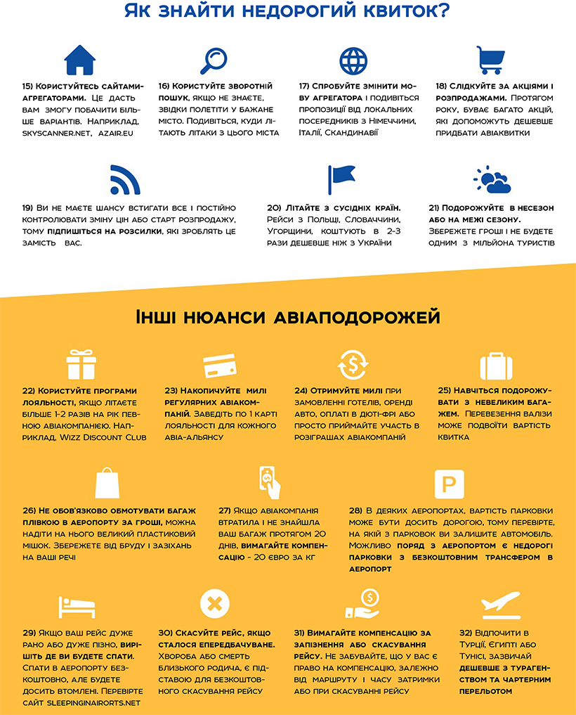 - Слідкуйте за акціями та розпродажами. Протягом року буває багато акцій,які допоможуть дешевше придбати авіаквитки.