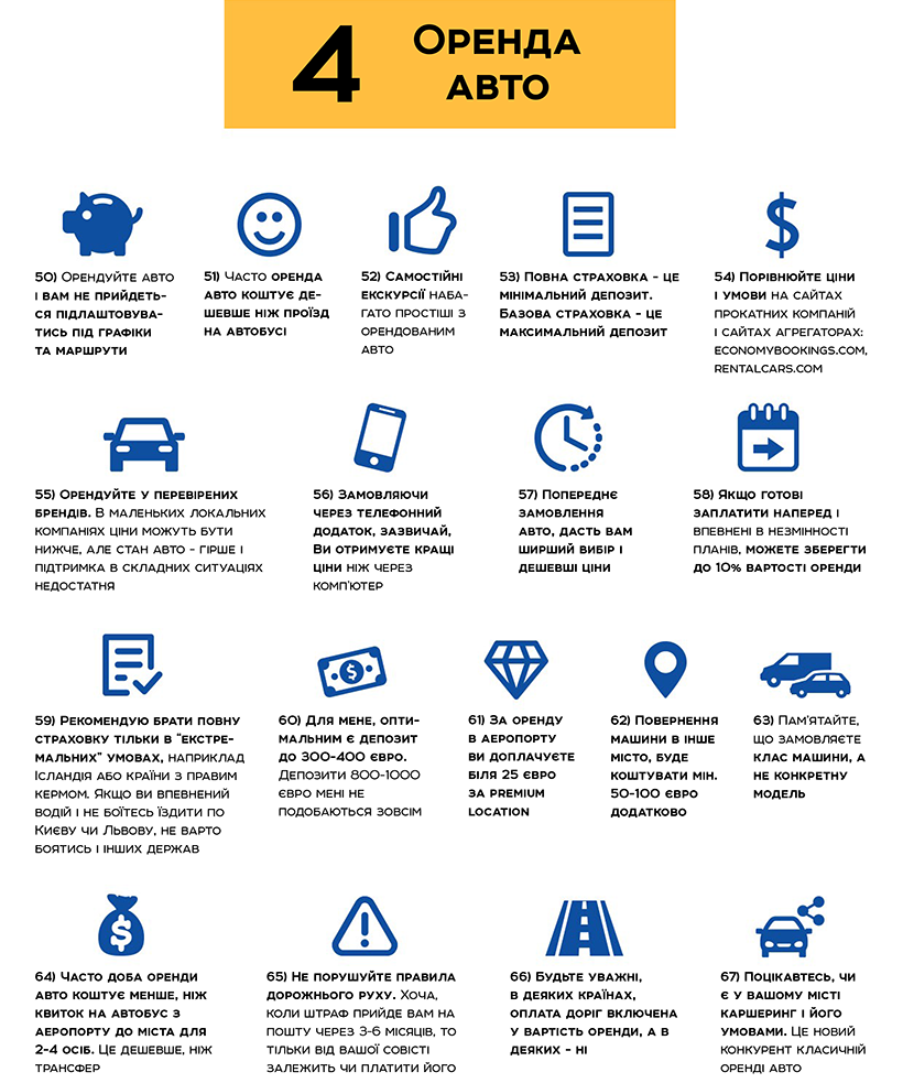 Мандрівник Віктор Стинич вже поділився з нами своїми лайфхаками щодо здешевшення авіаперельотів, вибору житла та головними принципами мандрівки. Теперь прийшов час розкрити секрети вигідної оренди авто: пункти 50-67 циклу “100 лайфхаків”.
