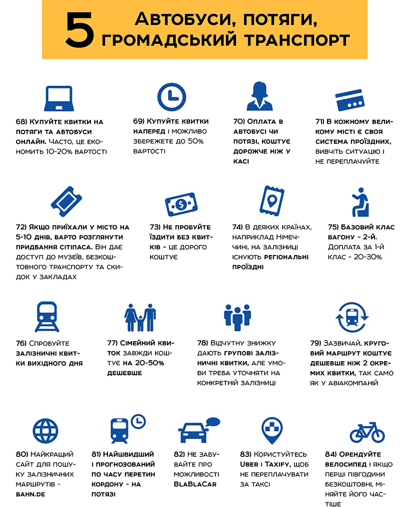 - Купуйте квитки на потяги та автобуси онлайн. Часто це економить 10-20% вартості.