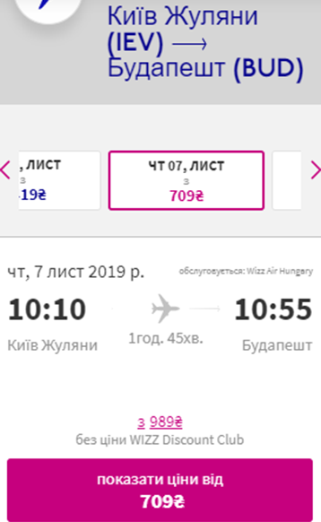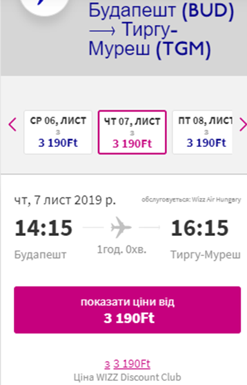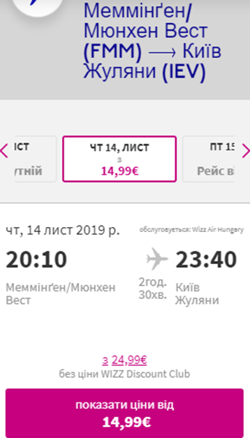 Дати – 7-14 листопада. Вартість квитків – €58 у два боки для учасників wizz-клубу та €85 для всіх інших. По дорозі пересадки, без ночівель!
