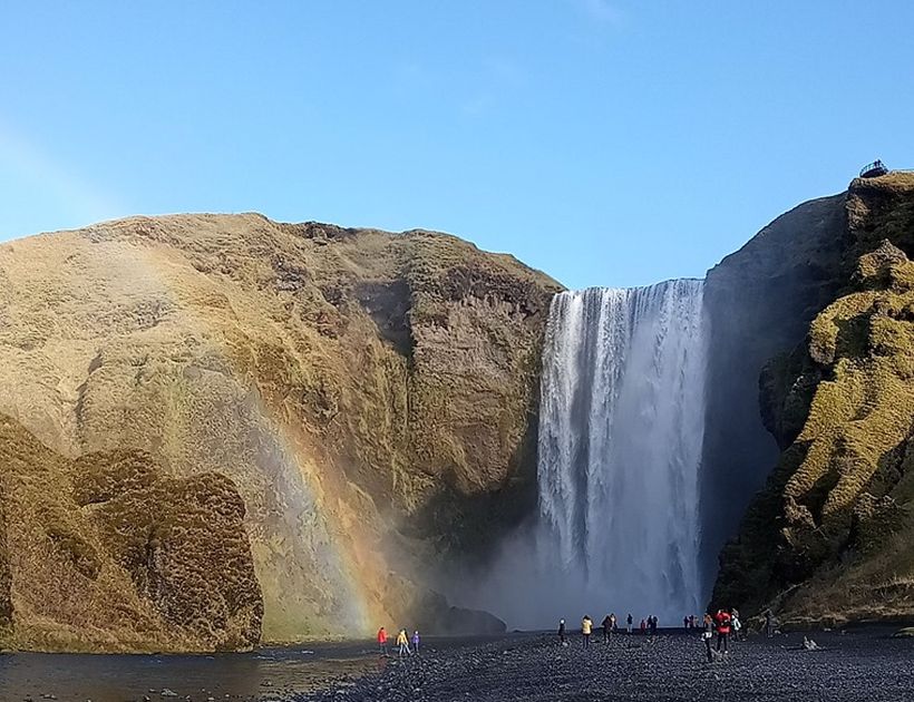 Сначала был прекрасный водопад Скогафосс возле которого удалось застать радугу, потом тающий ледник, после него огромный пляж с чёрным песком и напоследок ещё один красивый водопад. Эта экскурсия стоила 65 евро. Прекрасно было то, что в оба экскурсионных дня нас сопровождала солнечная, тёплая, безветренная погода – это позволило увидеть всё во всей красе, а во время передвижения на автобусе наслаждаться видами. Автобусы были комфортными, всё организовано отлично – было время и на осмотр достопримечательностей, и на небольшой отдых, и на обед в хороших местах. Еда в Исландии мне очень понравилась – вкусно, сытно и щедро. Особенно рекомендую блюда из морепродуктов и баранины. Но пицца, например, тоже вкусная.