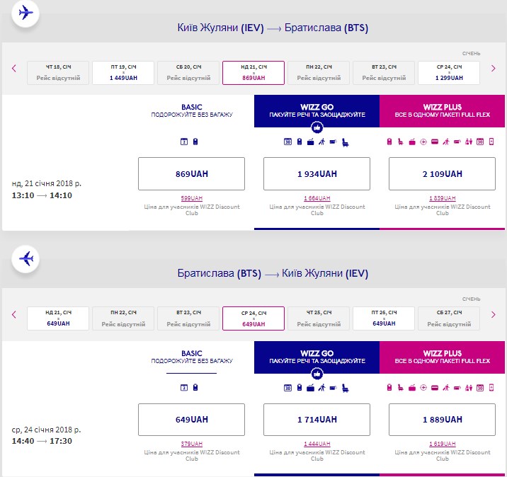 Київ – Братислава, 21-24 січня 2018 року, €32 в обидва боки для учасників Wizz club.