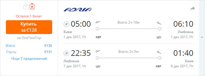 Авиакомпания Adria Airways предлагает прямые рейсы из Киева в Любляну. Стоимость – €128 в обе стороны. Даты – 1-7 декабря.
