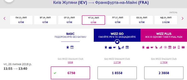 Київ – Франкфурт-на-Майні, 26 липня-7 серпня – 44 євро у два боки для членів Клубу та 64 євро для всіх пасажирів.