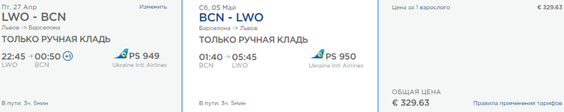 Для примера предлагаем перелет по маршруту Львов – Барселона и обратно на даты 27 апреля – 5 мая. Стоимость перелета в обе стороны – €329,63. Тариф включает провоз только ручной клади.