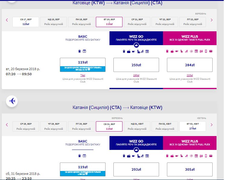 Катовіце – Катанія, 20-31 березня -35 євро 38 євро у два боки для учасників Wizz club, 57 євро – для всіх пасажирів.