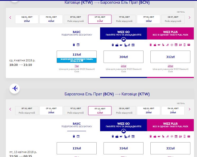 Катовіце – Барселона – 4-13 квітня, 38 євро у два боки для учасників Wizz club, 59 євро – для всіх пасажирів. Та інші дати.