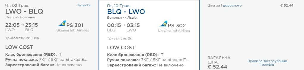 Львів – Болон’я, 2-10 травня – 52,4 євро у два боки.