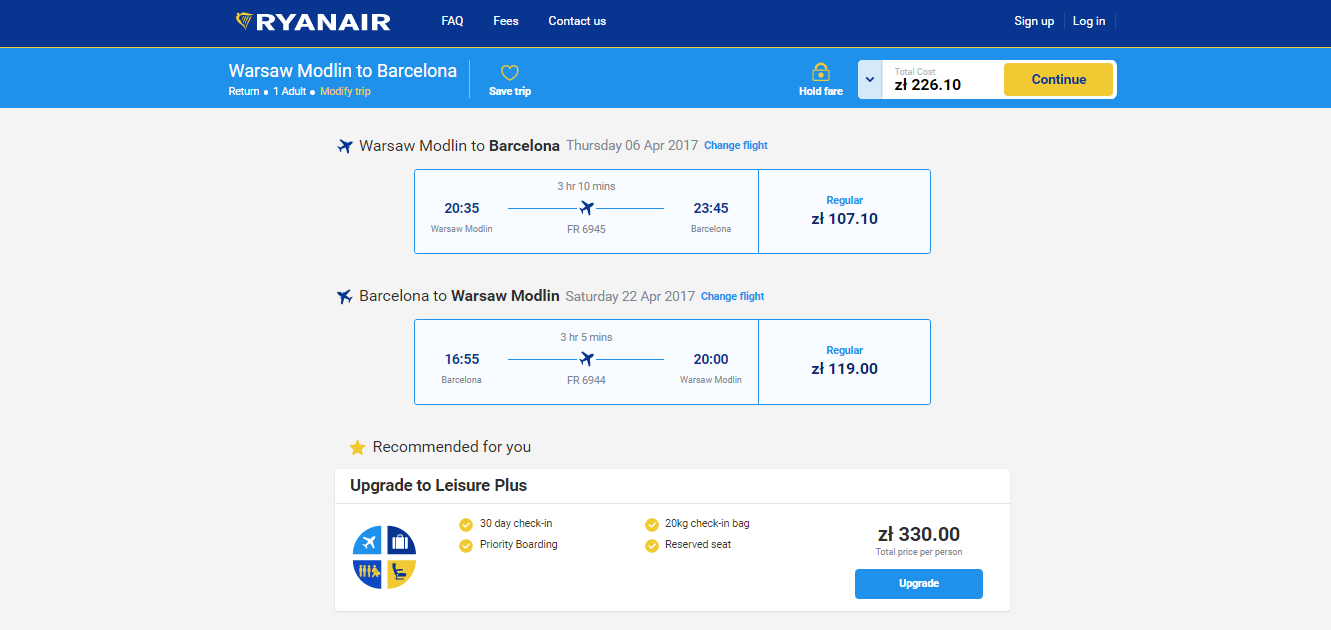 В этот же день в 20:35 вы садитесь на самолет в аэропорту Варшава Модлин. Прилетаем в Барселону в 23:45. Рейс прямой, можно с собой взять ручную кладь, багаж в цену не входит. Стоимость билета на самолет €52 туда-обратно. Купить можно тут .