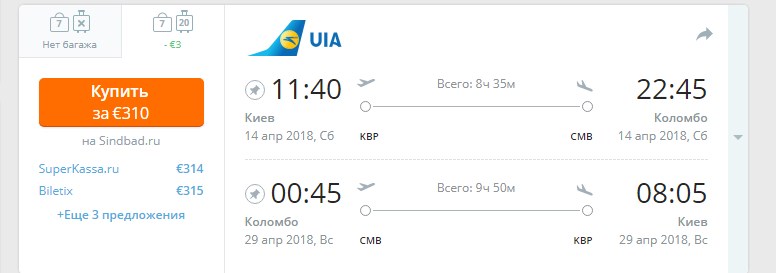 Київ – Коломбо, 14-29 квітня – €310 у обидва боки. Час у польоті складає 8,50 год. по дорозі у Коломбо та 9,50 год. на зворотньому шляху.