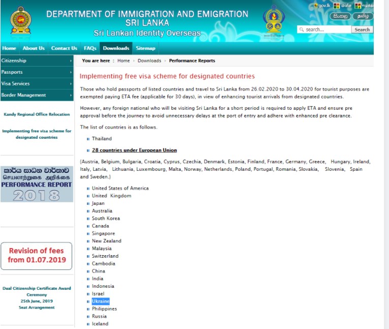 Уряд Шрі-Ланки в черговий раз 26 лютого скасував плату за в’їзд у країну громадянам 48 країн світу, в тому числі України. Це правило буде діяти до 30 квітня 2020 року. З відповідним повідомленням можна ознайомитися на сайті департаменту імміграції та еміграції Шрі-Ланки.