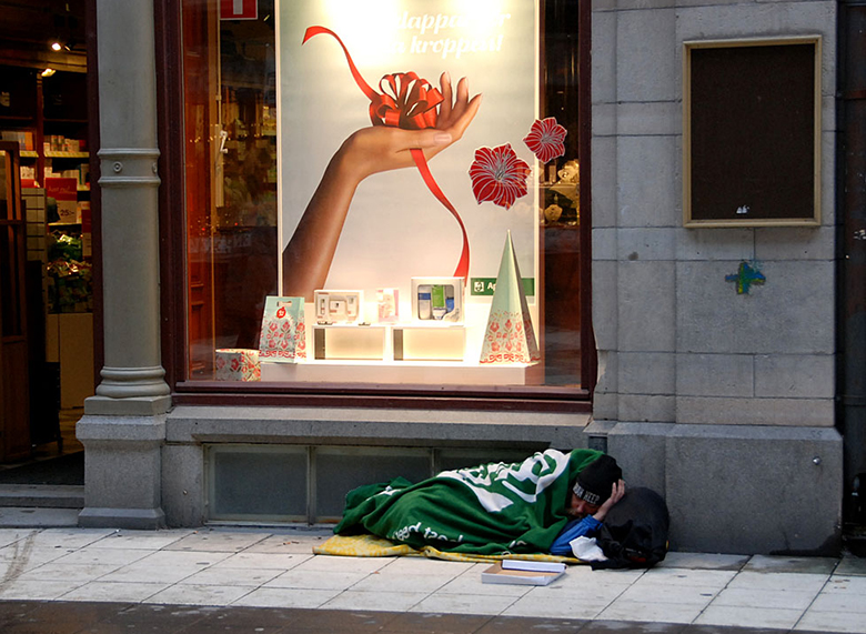 Особенно резко и инородно в Стокгольме выглядят бомжи. Если в Нью-Йорке бомж такой же обычный персонаж городской трагедии, как и белый воротничок, а в Дели чисто одетый индиец выглядит как король, идущий по мусорке, то в Стокольме бомжи выглядят как исчадье ада в фуфайке посреди райского сада.