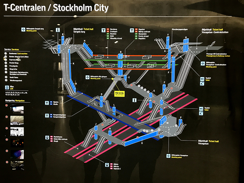 SL-card за €24 на 3 дня даёт возможность ездить на пригородных поездах, на метро (Т-bahn), автобусах и даже на паромах! С этой картой вы не только доберетесь из аэропорта в абсолютно любое место Стокгольма, но и вообще измените отношение к передвижению по городу. Весь транспорт ходит как часы. Указатели размещены настолько удобно и очевидно, что даже на четырехуровневой (!) развязке T-Centralen мы ни разу не замедлили шаг, пересаживаясь с метро на электричку минуя два этажа. При том, что в Стокгольме живет 789 тыс. человек, станций метро у них примерно в 2 раза больше, чем в 4-х миллионном Киеве.