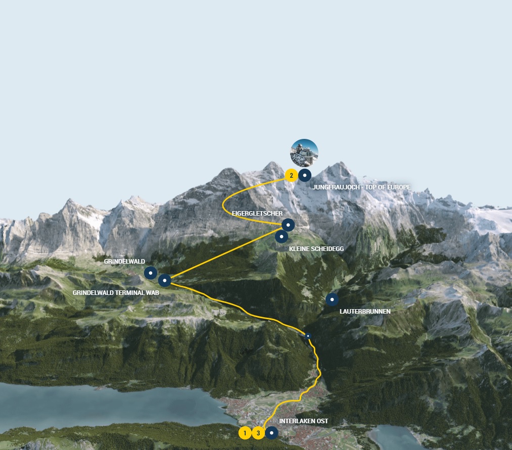 Поїздка по Юнгфрауйох веде через мальовничі долини, повз величні гори та льодовики, даруючи незабутні враження. Загальна довжина Юнгфраубан – 9 км, 7 з яких поїзди проходять у тунелі. Від першої до останньої станції перепад висоти становить 1400 метрів, а вся дорога займає близько півгодини.