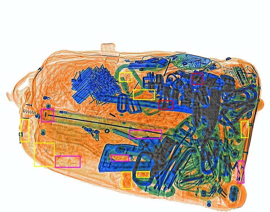 Працює інтелектуальна обробка зображення. На цьому зображенні жовтими рамками обведені предмети, схожі на вибухівку. Рожеві рамки – оточують об’єкти подібні до наркотиків. Червоні рамки – це попередження про об’єкти, що не просвічуються рентгенівським випромінюванням.