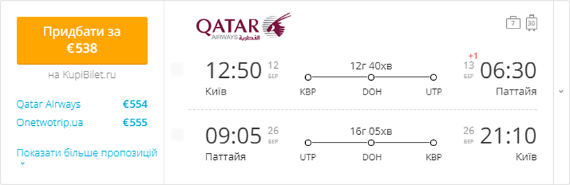 Як зразок пропонуємо переліт з Києва в Паттайю через Доху. Дати подорожі – 12-26 березня. Очікування в Досі по дорозі в Таїланд займе менше години, а на зворотньому шляху – 3 г. 5 хв. Ціна квитків у два боки становить €538. У вартість перельоту входить також провоз багажу (30 кг) та ручної поклажі (7 кг).