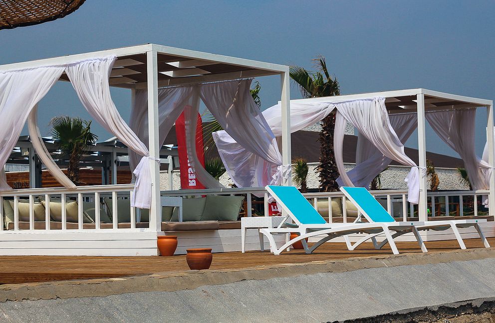 На пляже открыто множество кафе и ресторанов, голодными вы тут не останетесь. Есть зоны, где за небольшую плату можно отдыхать в беседках или под соломенными навесами.