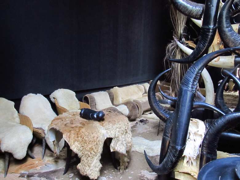 Останки животных соседствуют с с глиняной посудой, плетеными корзинами, хозяйственными станками, клетками с живыми питонами и птицами. Несколько экспонатов изображают мужские половые органы.