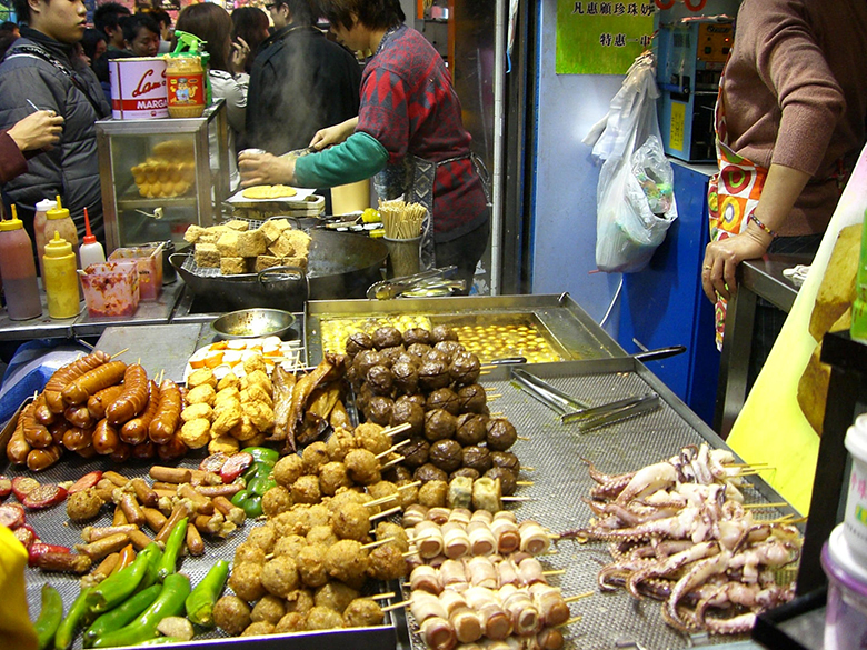 На прочном шесте через плечо продавцы носят две увесистые корзины, наполненные едой для легких перекусов. Набор стандартный: яйца, порционное мясо на палочках, фрукты, готовые обеды. Обычно продавцы ходят по людным улицам и выкрикивают названия своей еды. Цены их снеков – в районе $1.