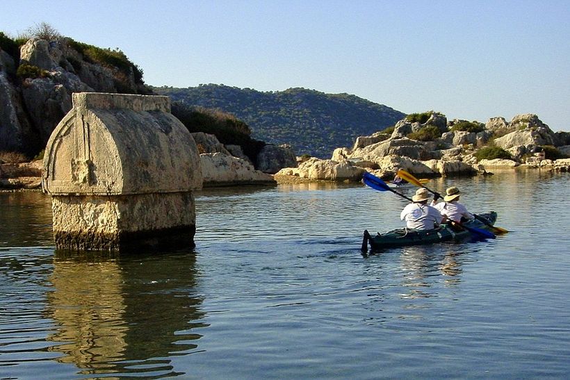Вдоль побережья сохранились руины ликийских гробниц, издалека виден замок-крепость Simena. Но самое интересно виднеется вдалеке – каменные саркофаги, напоминающие перевернутую лодку. Это захоронения ликийцев, которые верили в загробную жизнь и хоронили усопших по определенным правилам. Так, тело умершего укладывали в гробницу в позе зародыша, в рот клали монету как плату за проезд в царство мертвых. В саркофаге делали отверстие, из которого орел забирал душу на небо.