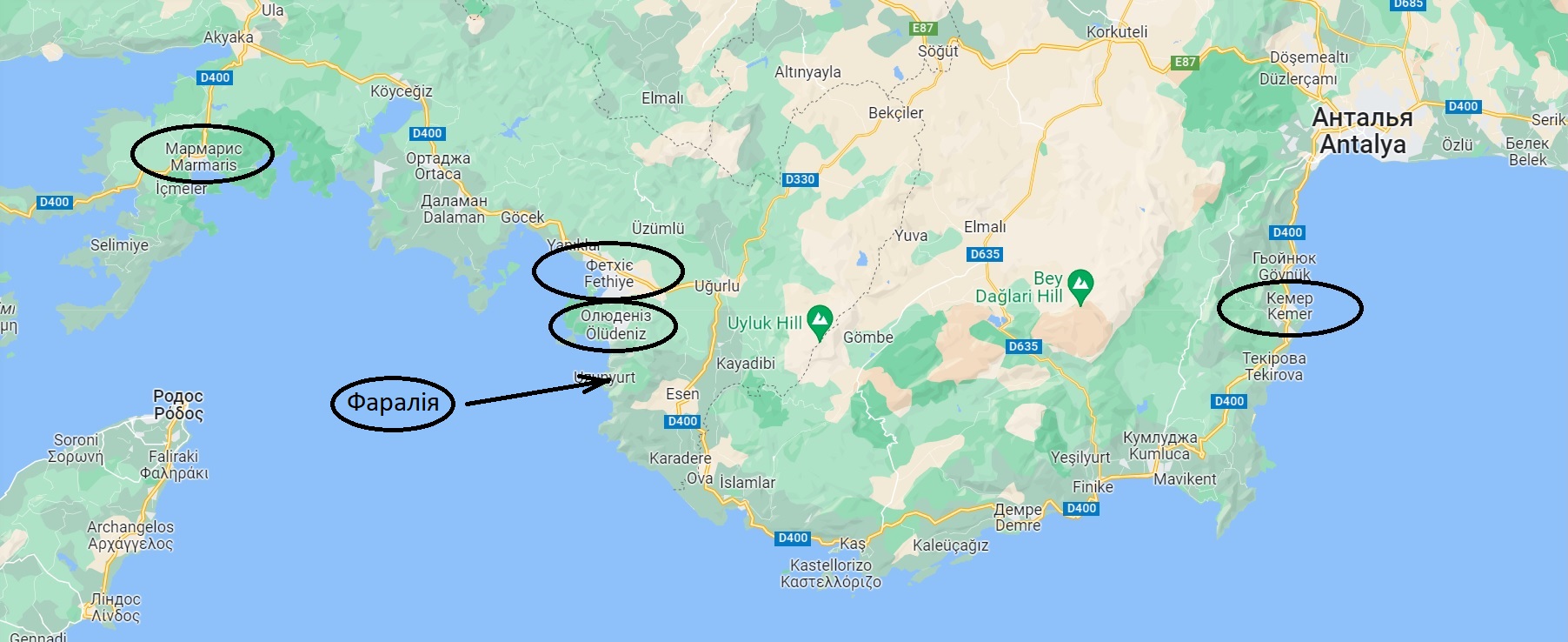 Розташоване за 12 км від відомого містечка Олюденіз. Цей район уникнув туристичної забудови та доступний лише з боку Лікійської стежки чи крутого гірського шосе-серпантина. За 2 км від Фаралії знаходиться дивовижна Долина Метеликів.