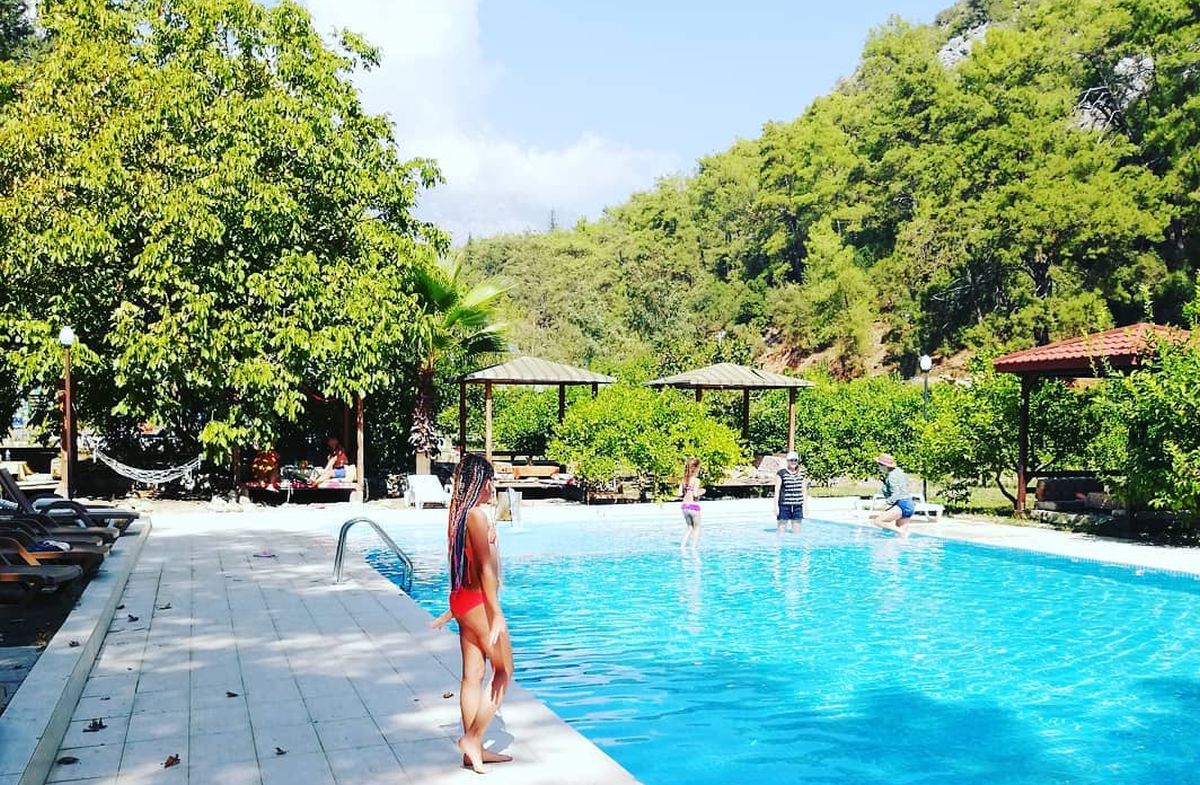 Що стосується території, дуже компактна і доглянута, один басейн і невелика гірка, поруч бар, працює з 10.00 до 21.00. Другий басейн дитячий, тепліший в мандариновому гаю, гамаки, диванчики, гойдалки, дуже по-домашньому. Відпочиваючі – турки, білоруси і ми.