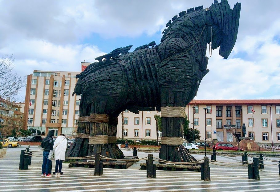 З першим троянським конем ви познайомитеся у місті Чанаккале. Він служив реквізитом на зйомках фільму “Троя” у 2004 році, і залишився на набережній як подарунок від Бреда Пітта. Експонат став візитівкою міста і нагадуванням, що неподалік знаходиться археологічний парк – древнє місто Троя.