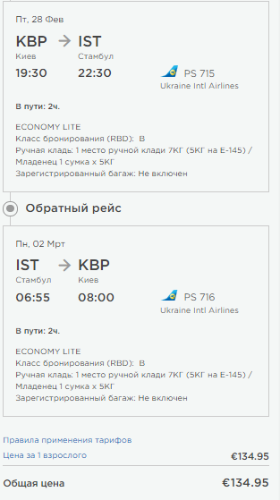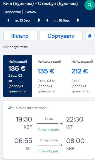 Приклади цін в один бік з Києва в Стамбул на сайті МАУ: