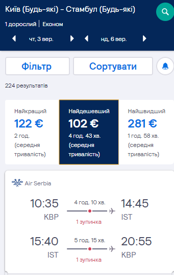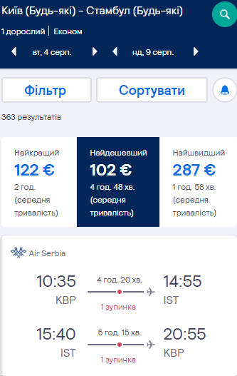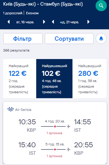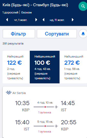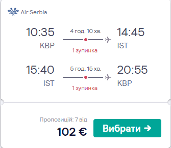 Air Serbia пропонує недорогі квитки на рейси з Києва в Стамбул від €100 у два боки.