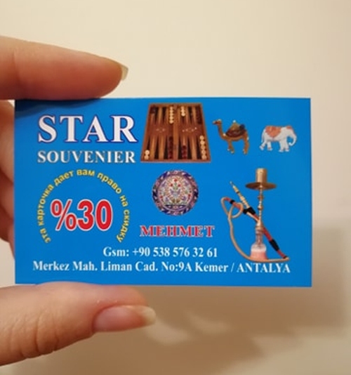 Продавці стали досить нав’язливими, бо сезон розпочався пізно, людей мало а продати туристичний крам необхідно. Але це допомагає виторгувати гарну ціну. Особиста порада: обирайте магазини, де продавці не сидять на вулиці в очікуванні клієнтів. Так мені зустрівся чудовий власник магазину Мехмед, який чудово розмовляє англійською та російською. Він пообіцяв читачам Мандрії дуже приємні знижки. Додаю фото візитівки. Він є у вайбері та вотсапі).