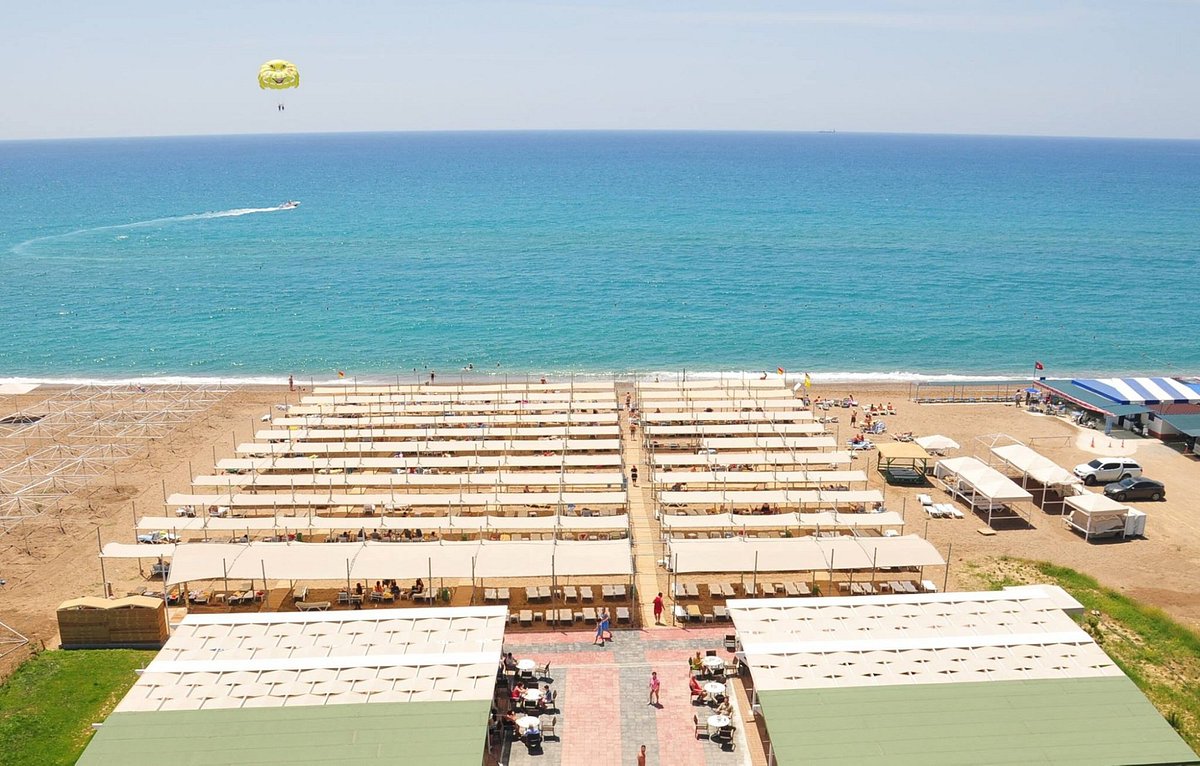 Пляж знаходиться за 750 м від готелю, автобус на пляж ходить з 09:00 до 17:00, за розкладом (раз на 20 хв) — безкоштовно. Протяжність пляжу – 70 м. На пляжі надаються всі послуги для гостей: дитячий майданчик, тенти, душ, кабінки для перевдягання, туалети, снек-бар 10:00-18:00 (безалкогольні напої, пиво, закуски).