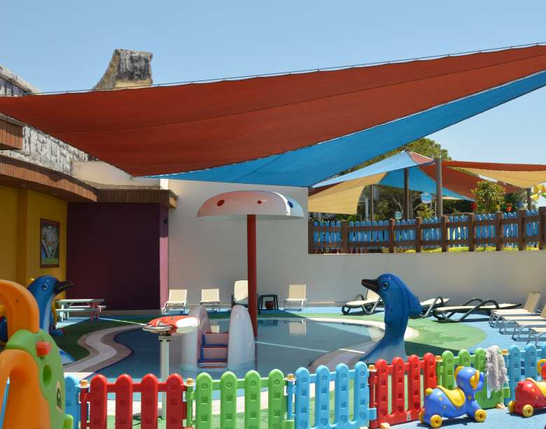 Все детские зоны – бассейны, игровые и спортивные площадки – должны быть под тентом, чтобы защищать детей от жары и ультрафиолета. Под навесом ребенок не перегреется. Вот так защищены от летнего солнца все открытые зоны отеля Xanadu Resort в Белеке.