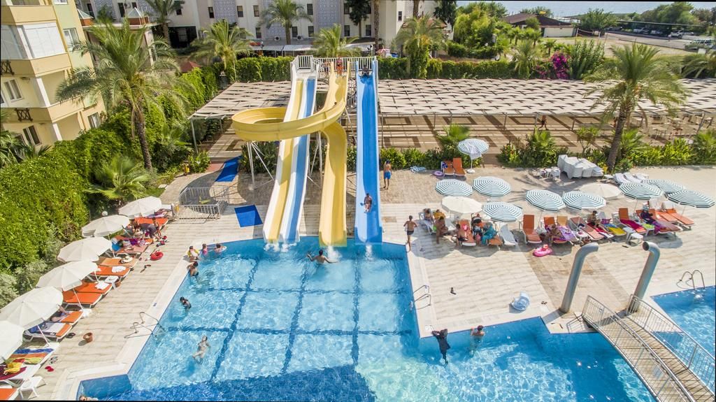 Про готель. Знаходиться на 2 лінії, пляж за 50 м від готелю. Є ресторани, бари, відкритий і критий басейни, безкоштовний Wi-Fi, Для дітей – гірки, дитячий басейн, дитячий майданчик, міні-клуб. З розваг – настольний теніс, тенісний корт, волейбол, баскетбольний майданчик, тренажерний зал, аеробіка, дискотека, анімація.