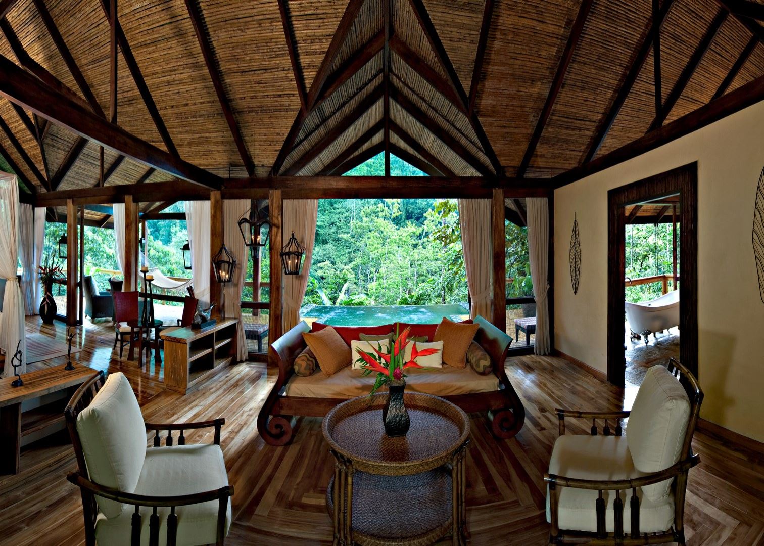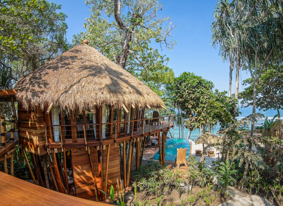 Просыпайтесь под звуки щебетания птиц и засыпайте на шум волн – глубже отдыха не бывает. В доме, облепившем ствол дерева, есть гостиная под открытым небом, ведущая в бассейн с видом на тропики. На втором этаже – спальня с видом на океан.