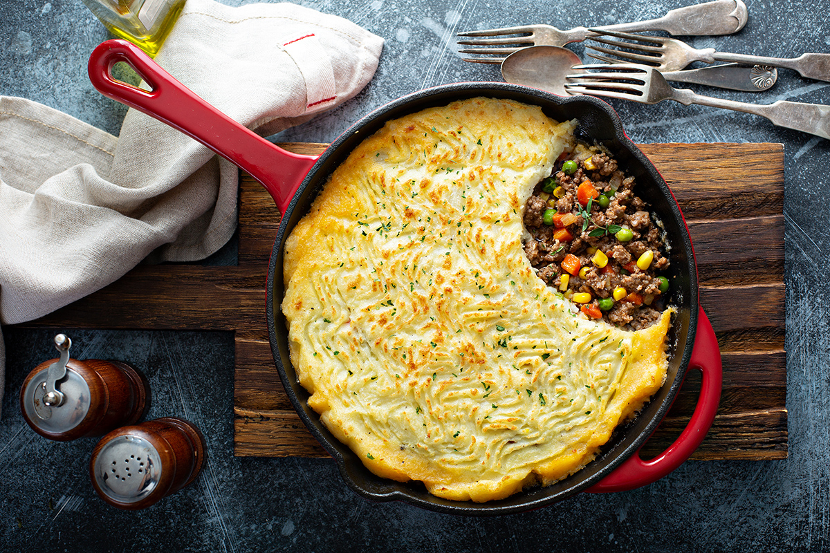 Заказывая пастуший пирог (Shepherd’s pie) вы попробуете на вкус одно из самых известных британских блюд. Готовят его из бараньего фарша, запеченного с луком, сельдереем, морковкой, специями и картофельного пюре. Фарш выкладывают на противень, а сверху выкладывают пюре, затем запекают в духовке. Пирог подают с варенным или свежим зеленым горошком. Иногда его добавляют в сам фарш. Если в пироге используют говядину, то перед вами коттеджный пирог (Cottage pie).