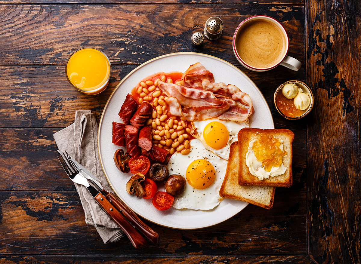 В британской кухне укоренилось выражение – английский завтрак (English breakfast). Где на одной тарелке соседствуют поджаренные сосиски, бекон, тост, фасоль в томатном соусе, яйцо-пашот и овощи. Это очень сытное и калорийное блюдо, но, британцам оно очень нравится. Многие рестораны и пабы предлагают «английский завтрак» в течение всего дня.