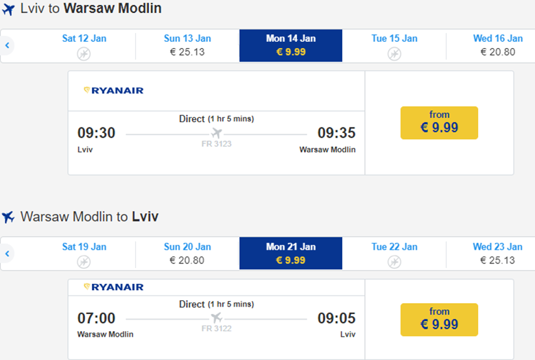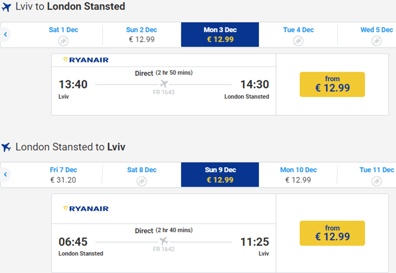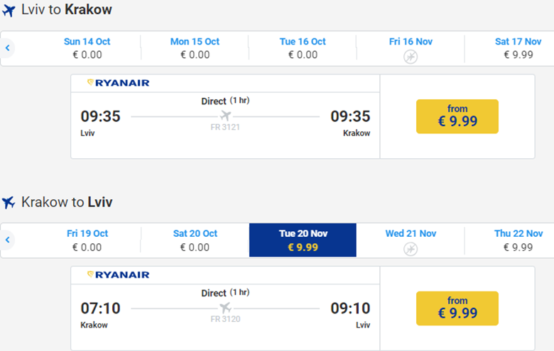 Авіакомпанія Ryanair пропонує дешеві перельоти зі Львова в Краків, Варшаву та Лондон. Ціни стартують від €20 у дві сторони. Не забуваємо, що з 1 листопада Ryanair скасовує безкоштовну велику ручну поклажу.