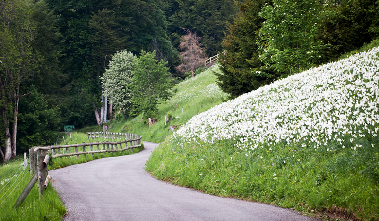 Нарциссы швейцарцы называют летним снегом – горным жителям везде мерещится снег. В Альпах нарциссы зацветают тогда, когда на равнинах о них давно уже забыли и любуются бутонами роз. В последних числах мая склоны гор покрываются белым великолепием, и гулять по альпийским тропинкам в окружении нарциссовых лугов – романтичнее истории не придумаешь.