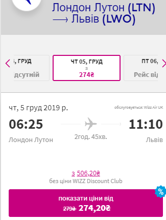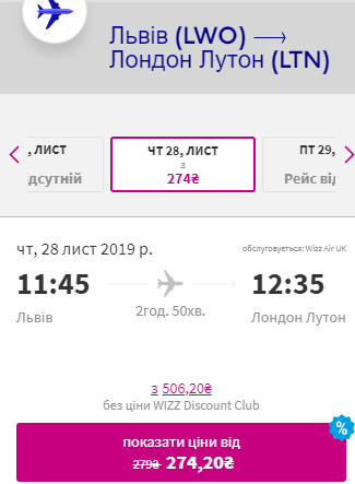 Львів — Лондон, 28 листопада-5 грудня — €20 для учасників wizz-клубу та €38 для всіх інших