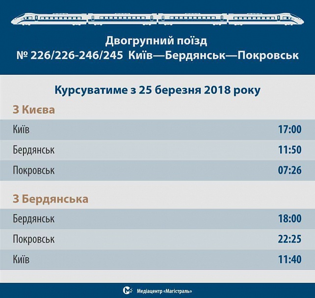 “Поїзд №226/226-246/245 курсуватиме з 25 березня. Таким чином ми уникаємо проблемного питання щодо нічного сполучення 120-тисячного Бердянську та ряду районів Донеччини зі столицею та іншими регіонами України”, – розповів Євген Кравцов.